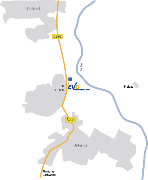 Vom Marktplatz Gaildorf auf der Kanzleistraße/B19 in Richtung Schulstraße/Fraschstraße starten. Dem Straßenverlauf auf der Karlstraße/B19 später B298 weiter in Richtung Unterrot/Gschwend folgen. Beim Umspannwerk nach links zum Kundencenter der Energie Versorgung Gaildorf abbiegen.